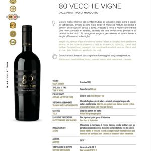 Hãy tận hưởng sự hoàn hảo của nó khi rượu được ủ lạnh ở nhiệt độ 13 -17 độ C, dù đã được lưu giữ trong một hộp gỗ và ẩn trong chai thủy tinh màu đen, đó cũng là cách tốt nhất để giữ cho chai vang 80 Vecchie Vigne luôn đậm đà đúng chất khi chúng ta muốn cất nó trong bộ sưu tập như một kỷ niệm.